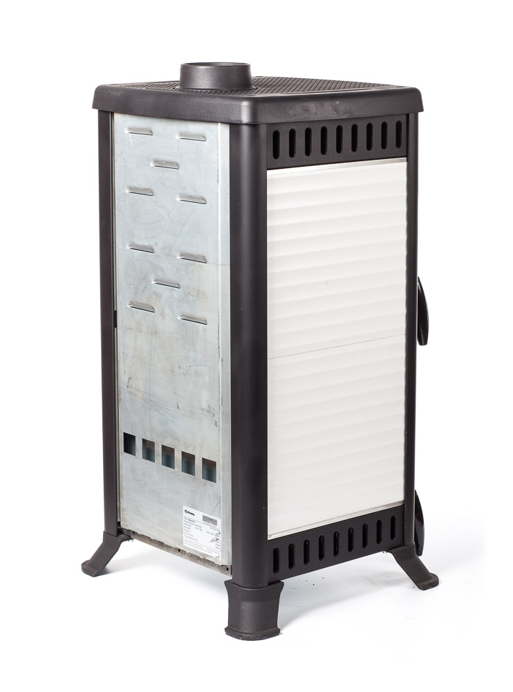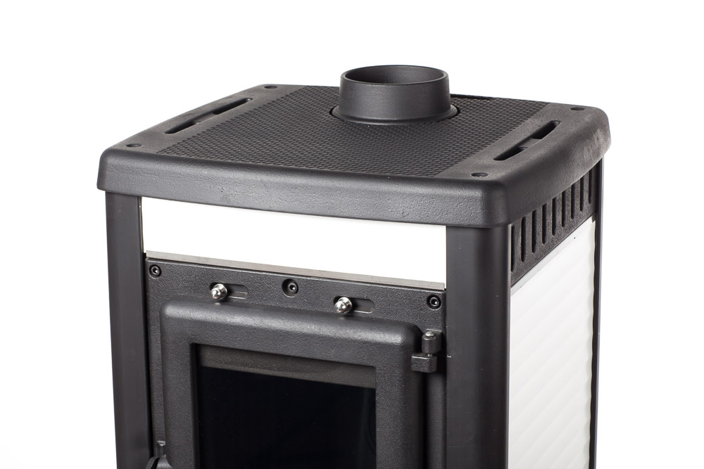 Тепловая мощность печи 8 кВт. КПД 82%. Систем длительного горения, работа в режиме тления до 8 часов. Система обдува стекла. Система дистанционного сброса золы с колосника. Загрузка дров фронтальная. Диаметр дымохода 120 мм. Расположение дымохода сверху. Отделка антрацит с керамическими вставками белого цвета. Размер стекла 313х221х4 mm.