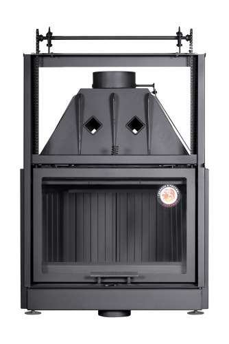 Главная особенность этой модели — подъёмная дверца на контргрузе, благодаря которой можно удобно загружать дрова и регулировать процесс горения. Система уравновешенных грузов работает тихо и надёжно, фиксируя дверцу в любом положении. Это делает камин безопасным и функциональным, особенно в интерьерах с активным использованием очага.