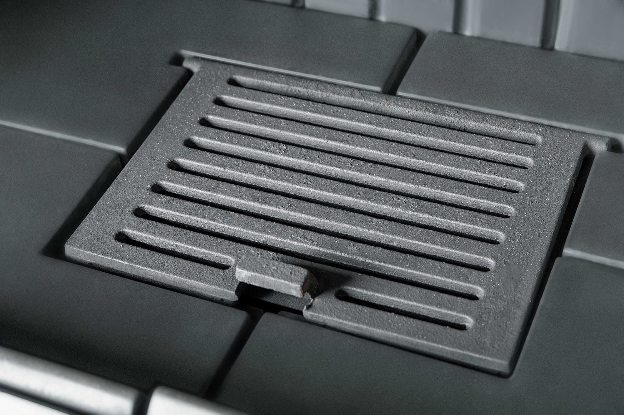 Это декоративный черный шамот с текстурой кирпича, который усиливает визуальный эффект огня и улучшает теплоаккумуляцию.