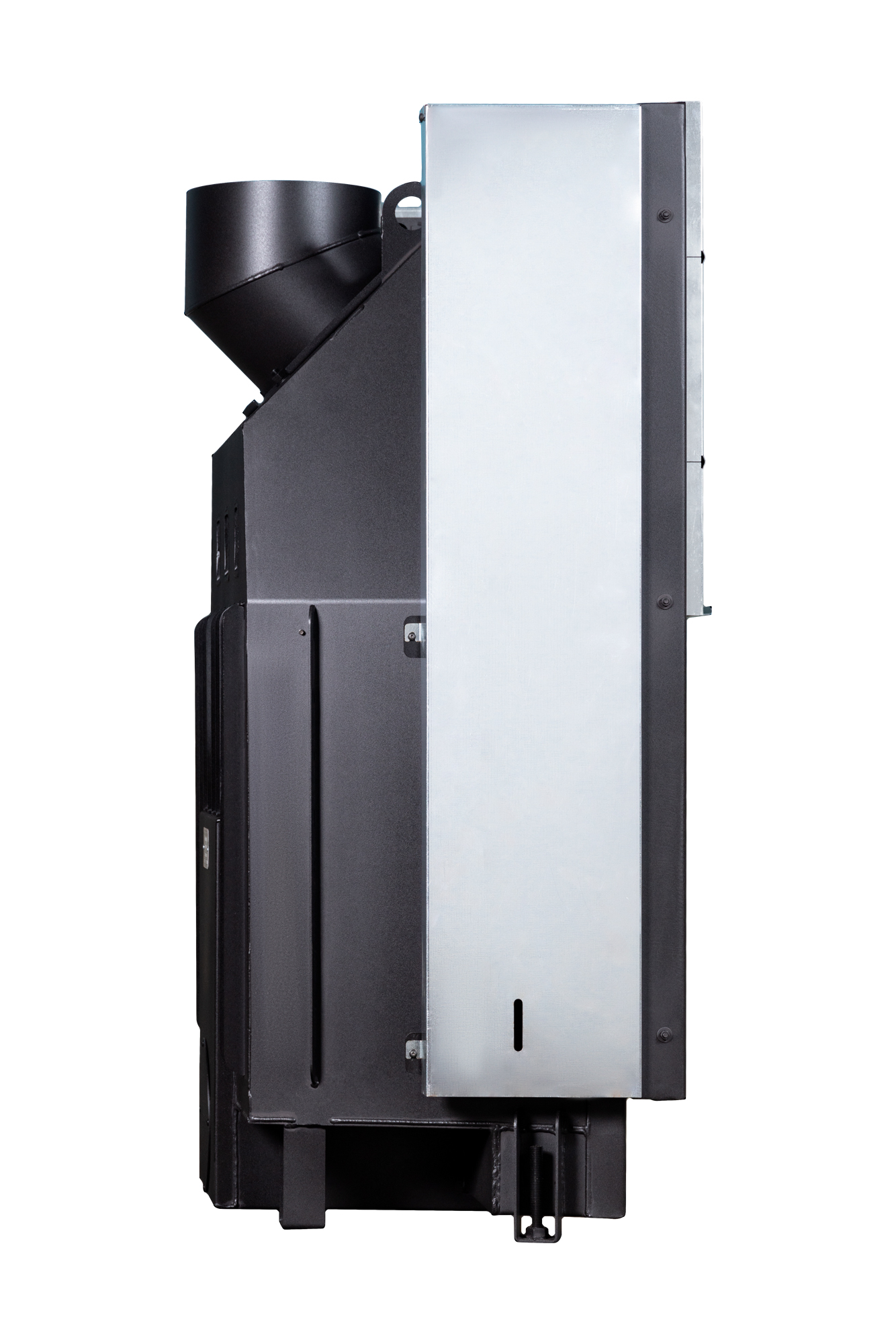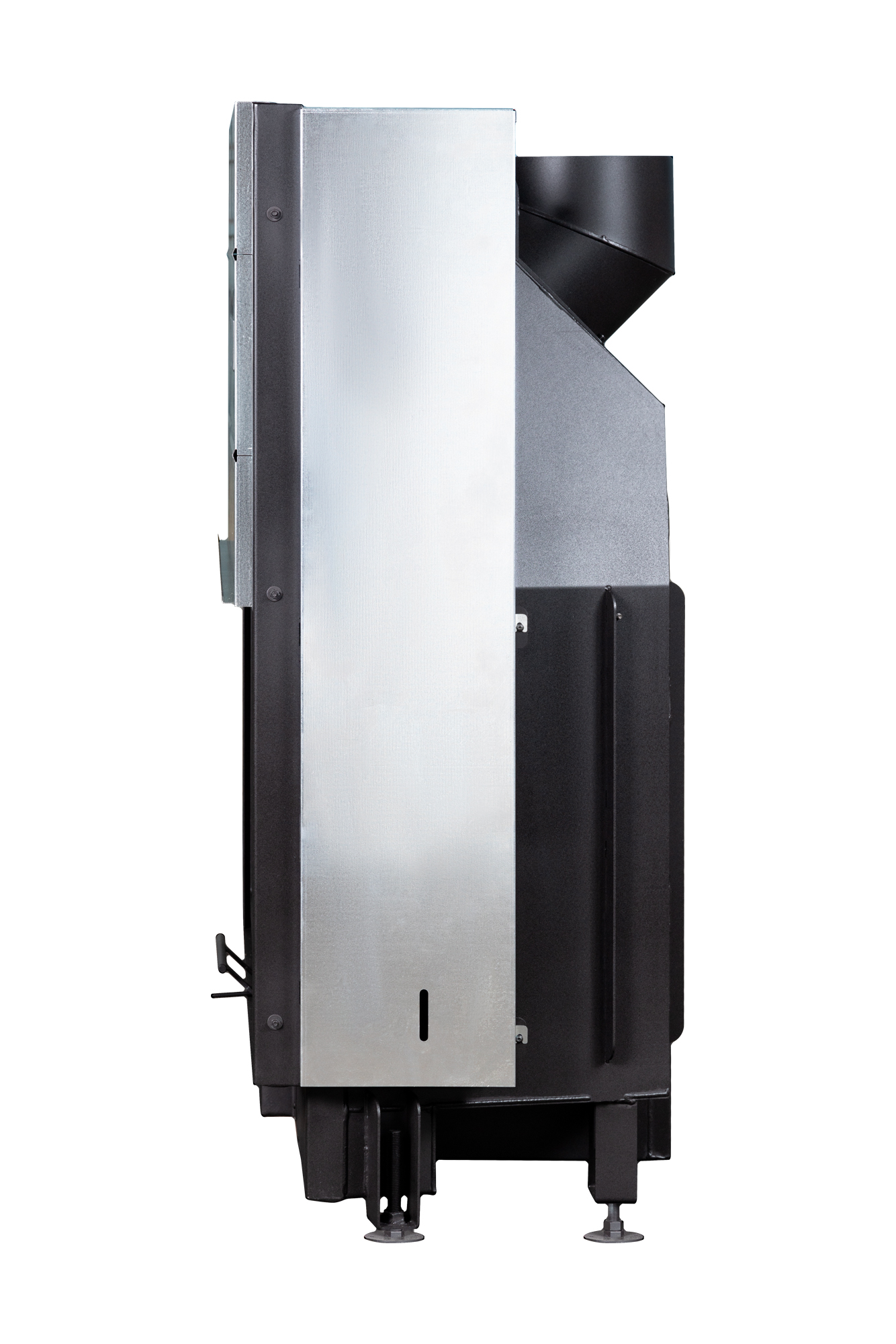 Модель оснащена большим жаропрочным стеклом (до 750 °C), подъемной дверцей с противовесом и системой распределения теплого воздуха, что делает её эффективным решением для отопления дома.
