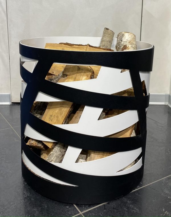 Для этой модели дровницы выбрано классическое чёрно-белое цветовое решение. Оно подчёркивает лаконичность современного дизайна в стиле хайтек. Завораживающий паттерн стальных полос, составляющих каркас дровницы, напоминает о космосе и отлично дополняет медитативную функцию камина. Дровницу легко и удобно использовать, она вместительна, но при этом не занимает много места. В основании дровницы установлены колесики, поэтому ее удобно перемещать куда угодно.